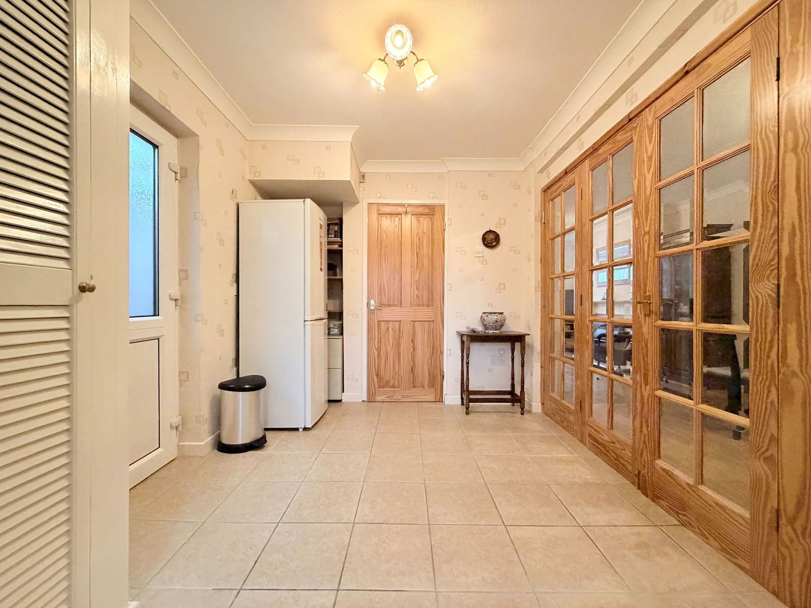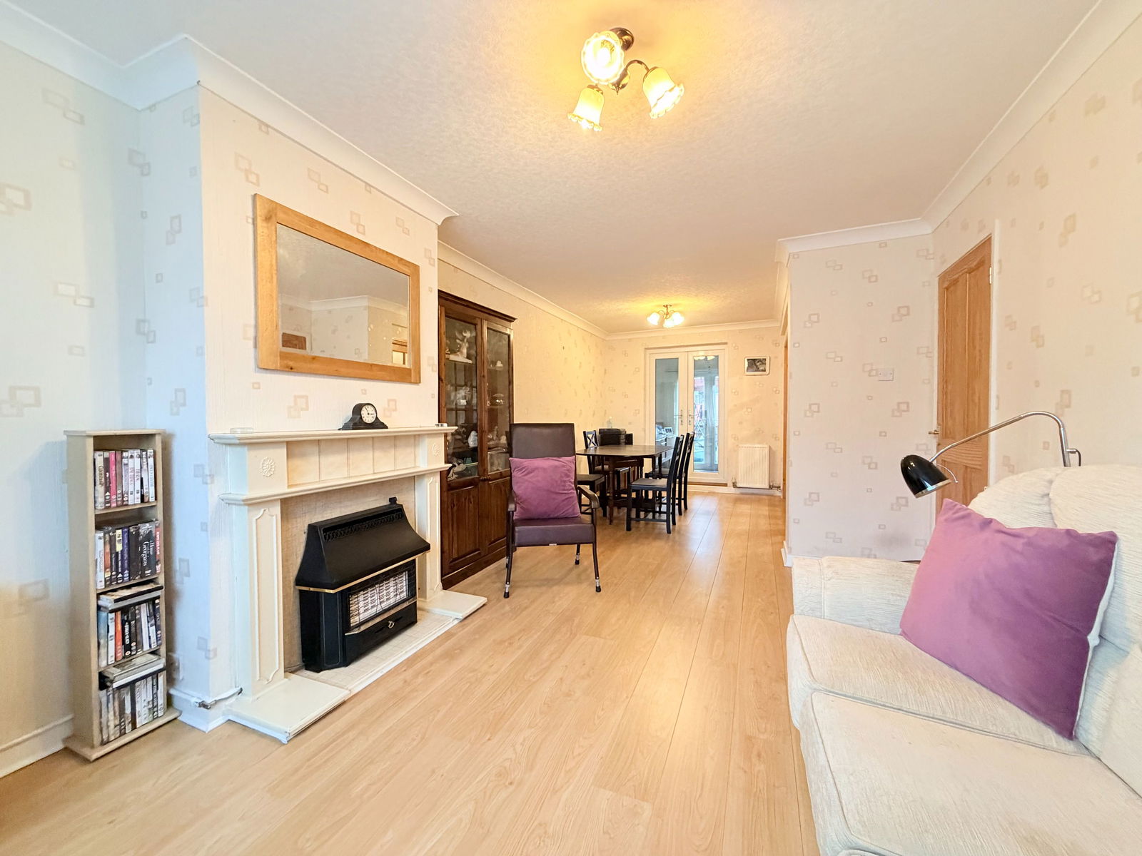 The spacious through lounge diner features a gas fireplace, wood-effect flooring, and glazed folding doors that open fully into the breakfast room, creating a flexible open-plan layout. Double-glazed French doors lead into a rear sitting room, which benefits from a ceiling fan and further French doors opening onto the south-facing rear garden. The breakfast room has a door to the side passage and is open plan to the kitchen area, which offers space for a freestanding cooker and washing machine.