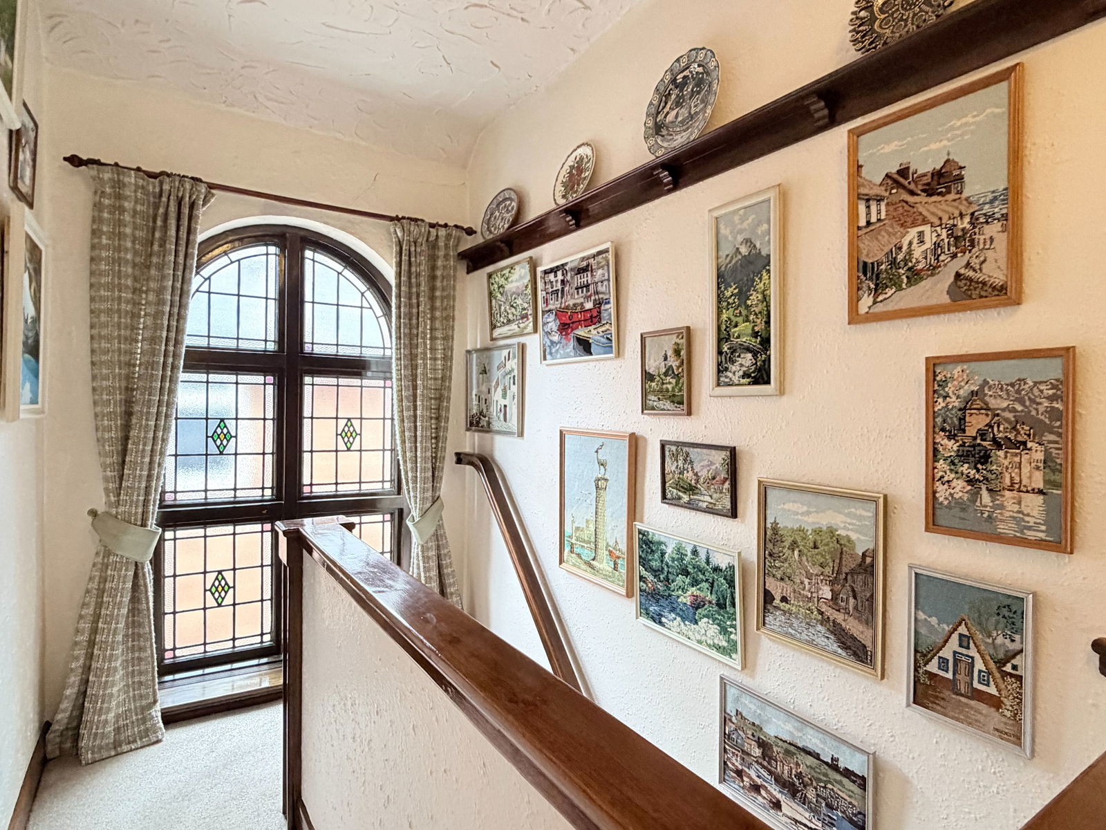 The first floor landing is particularly spacious and features a striking original arched window with obscure and coloured glazing and a picture rail. There are four bedrooms, with bedroom one enjoying a bay window to the front, bedroom two having a bay window to the rear along with fitted wardrobes and storage, bedroom three featuring a bow window to the front, and bedroom four being L-shaped to the rear with space for a single bed and home office area. Pull-down ladders from bedroom four provide access to a large loft which has been boarded, plastered and fitted with lighting. The bathroom is located to the rear, complemented by a separate WC.
