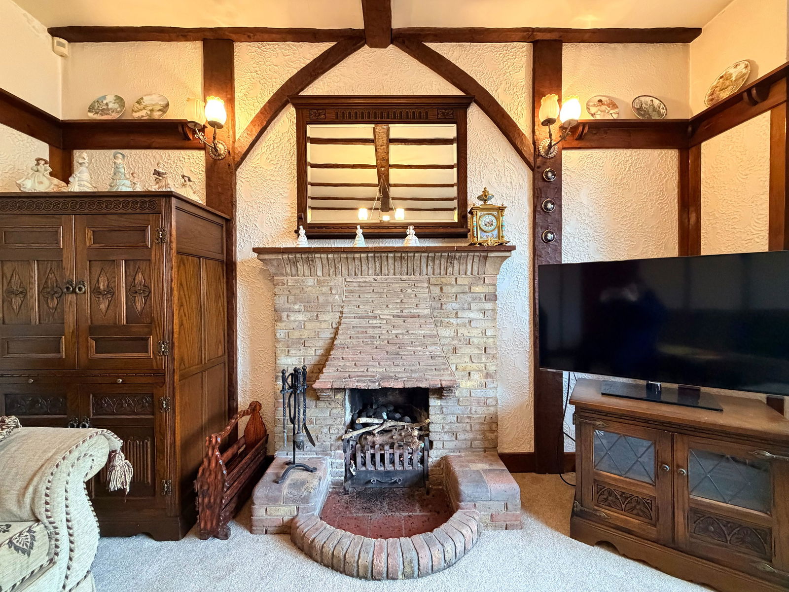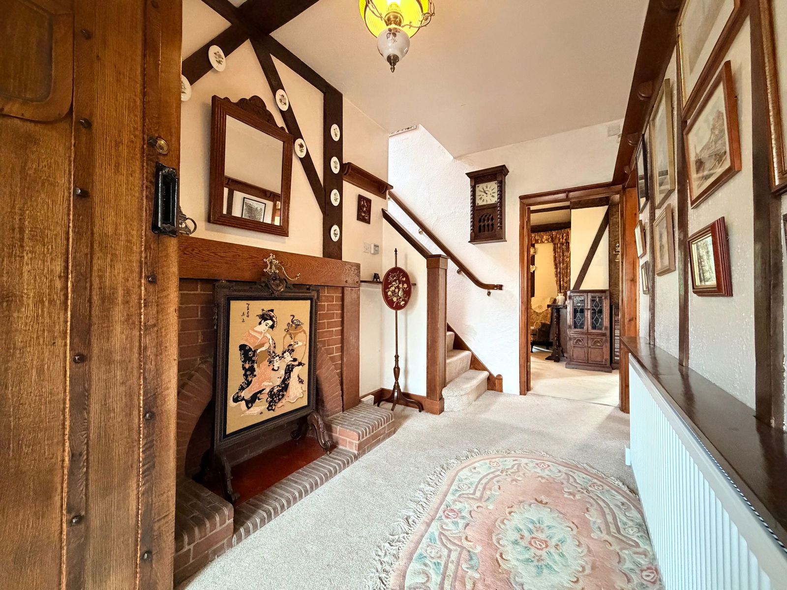 The property is set back from the road behind a driveway providing off-road parking, extending to part-glazed double wooden garage doors. There is also a feature arched door to a covered side storage area, gated access to the rear garden and a further arched doorway leading into an enclosed porch. A striking wooden front door with obscure glazed side panels opens into a grand reception hall showcasing a brick open fireplace, exposed wooden beams, ornate picture rail and staircase rising to the first floor.