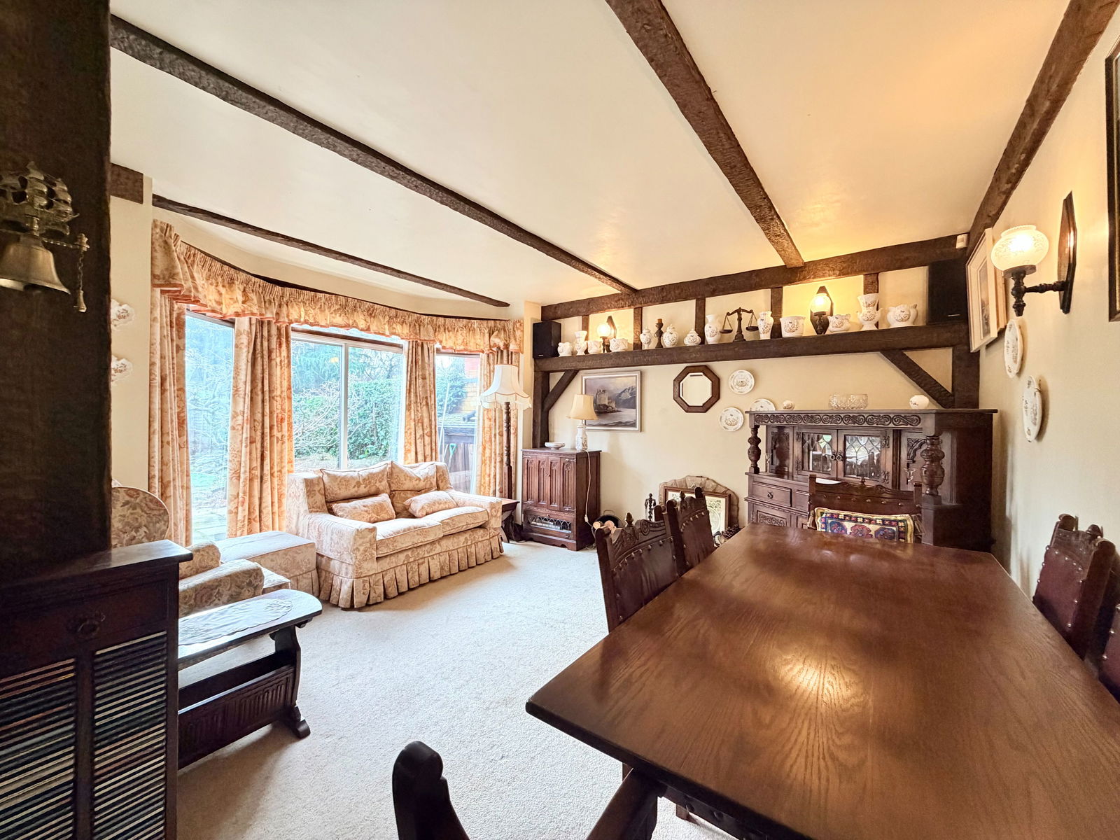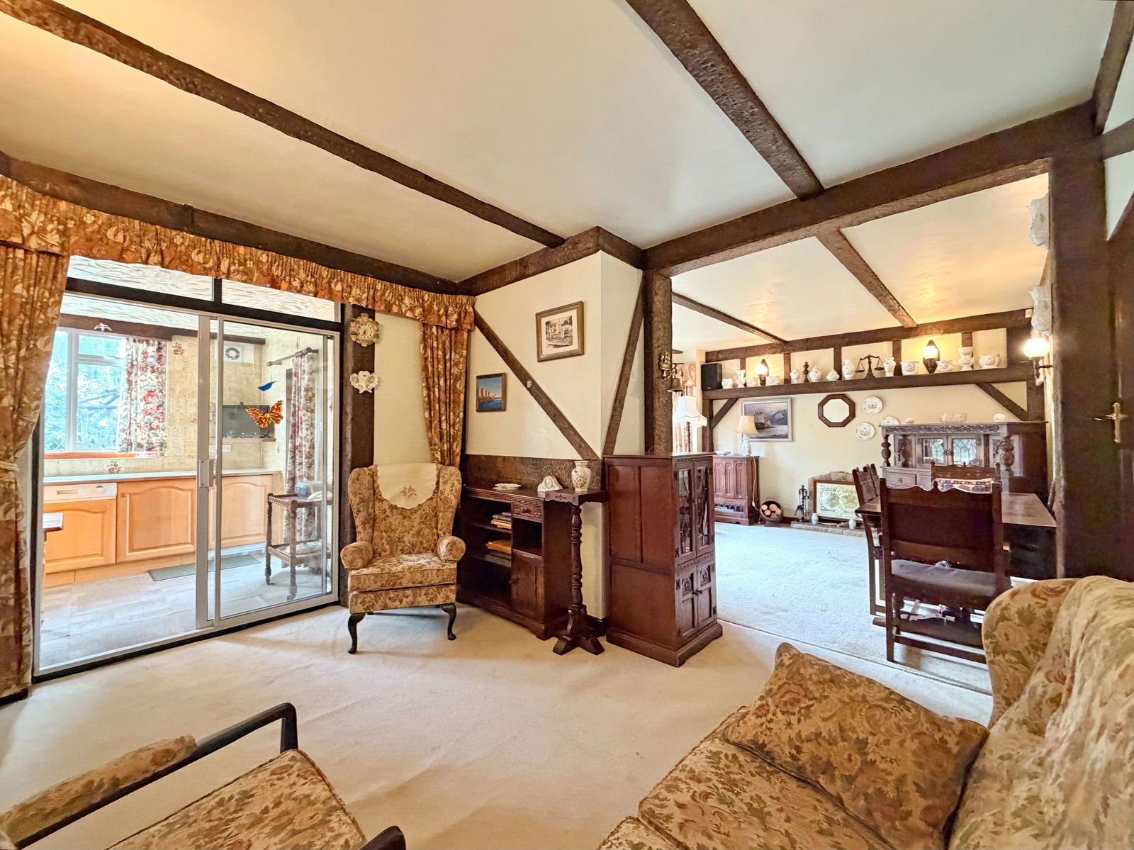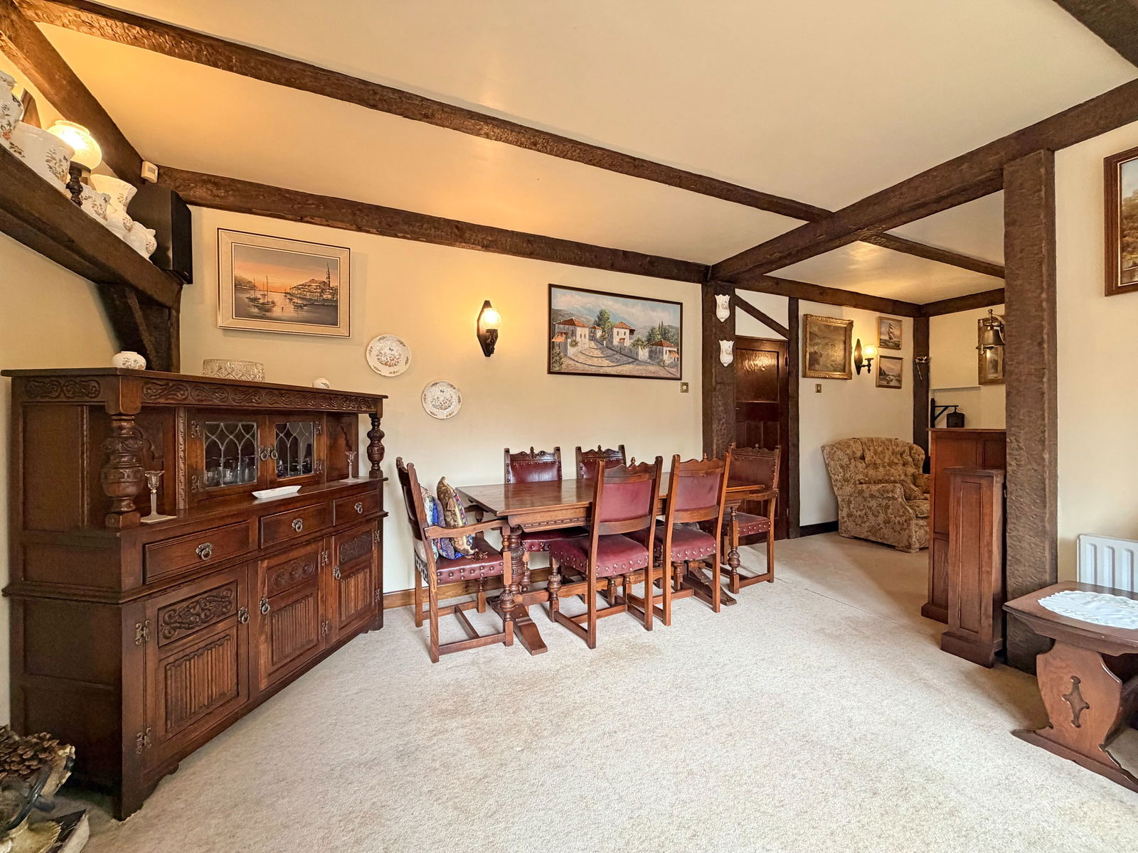 To the front is a formal lounge with a bay window, open fireplace with brick surround, exposed wall and ceiling beams and picture rail. To the rear, the dining room features a large bay incorporating sliding patio doors opening onto the rear garden, an additional open fireplace and exposed beams flows to the open-plan sitting area with further sliding patio doors leading into the L-shaped breakfast kitchen. The kitchen offers space for a breakfast table and is fitted with a gas hob, inset eye-level oven and grill, integrated dishwasher and further wooden beams, with access to the rear garden. An inner lobby provides access to the guest WC, the useful storage area to the side and internal access to the garage.