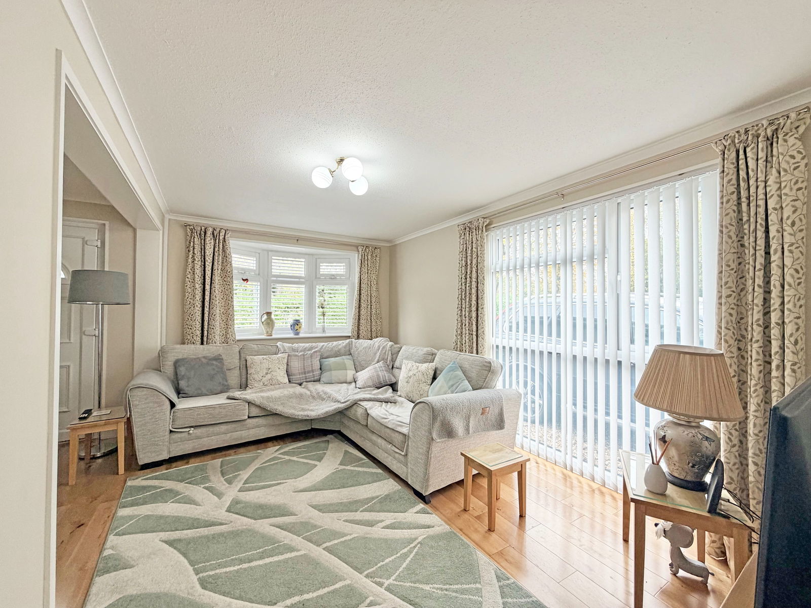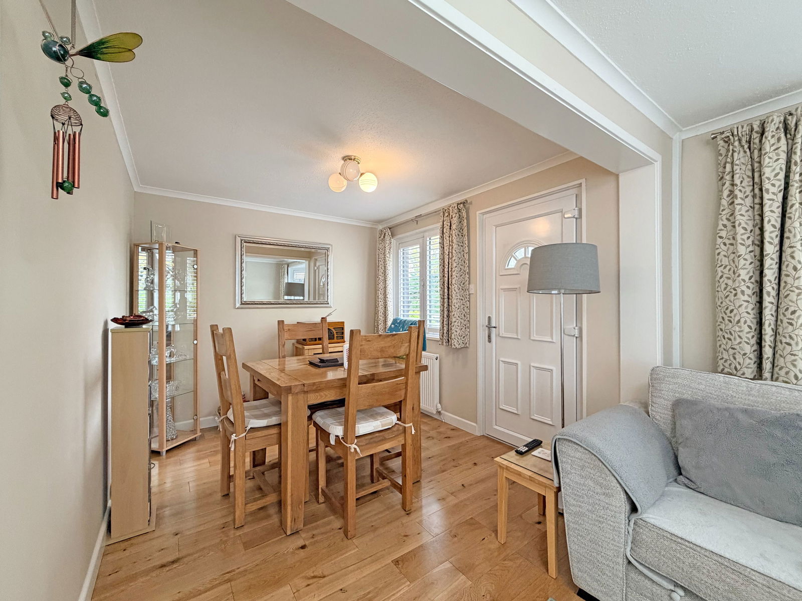 The property benefits from no upward chain and features a gated driveway to the side, offering off-road parking, and a pretty front terrace. Stepping inside, the dual-aspect L-shaped lounge/diner is bright and inviting, with UPVC American-style shutters to the front windows and wood-effect flooring throughout.