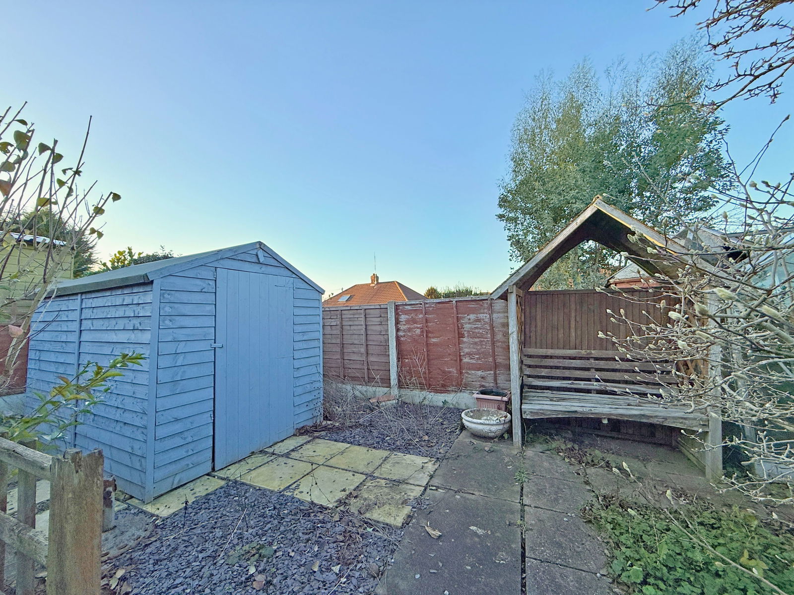 The delightful rear garden is a key feature, offering a paved patio, a lawned area, and a large timber shed—ideal for storage or hobbies.