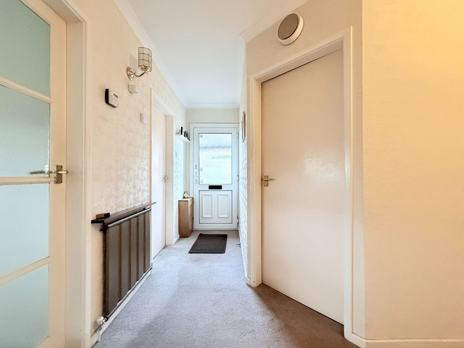 Set back behind a lawned fore garden, the property is approached via a driveway to the side providing off-road parking and leading to the garage. The main entrance is conveniently positioned to the side of the bungalow and opens into a central reception hall.