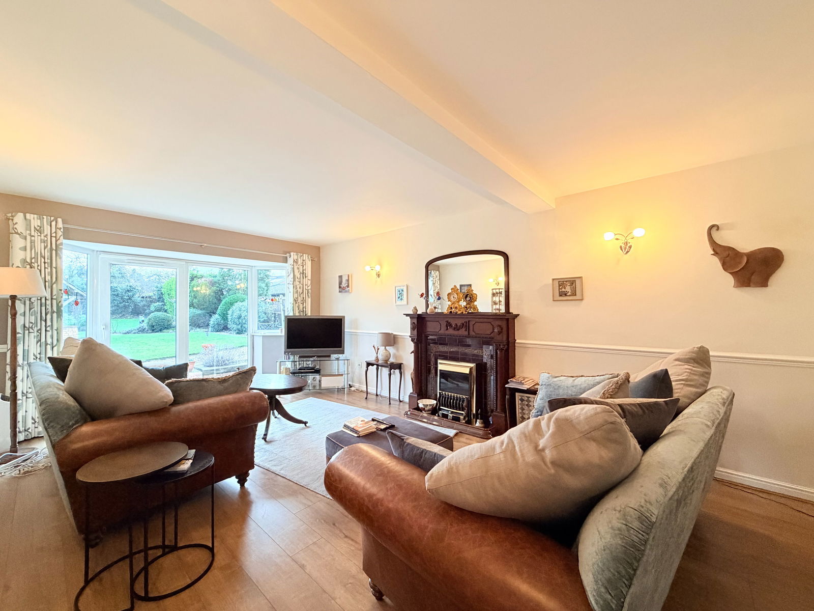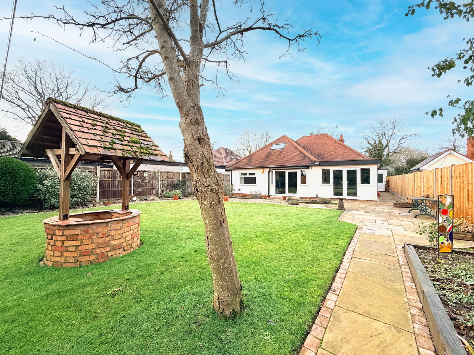 Outside, the southerly facing rear garden has been thoughtfully landscaped and beautifully maintained, offering large patio areas, seating spaces, mature trees, a decorative well and a timber shed, creating an attractive and private outdoor retreat.