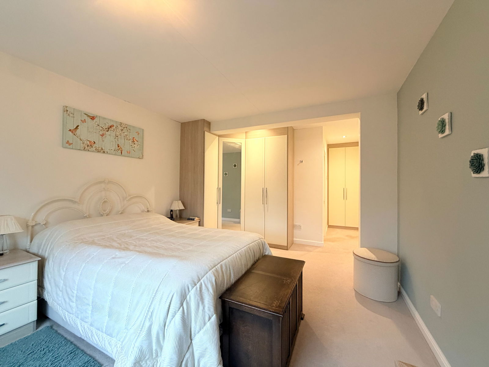 The spacious principal bedroom is also located on the ground floor, overlooking the rear garden and benefiting from fitted wardrobes and storage, together with access to a generous, modern en-suite shower room. The en-suite features an oversized walk-in shower, enclosed cistern WC and a stylish vanity unit with storage drawers, wash hand basin and wall-mounted tap.