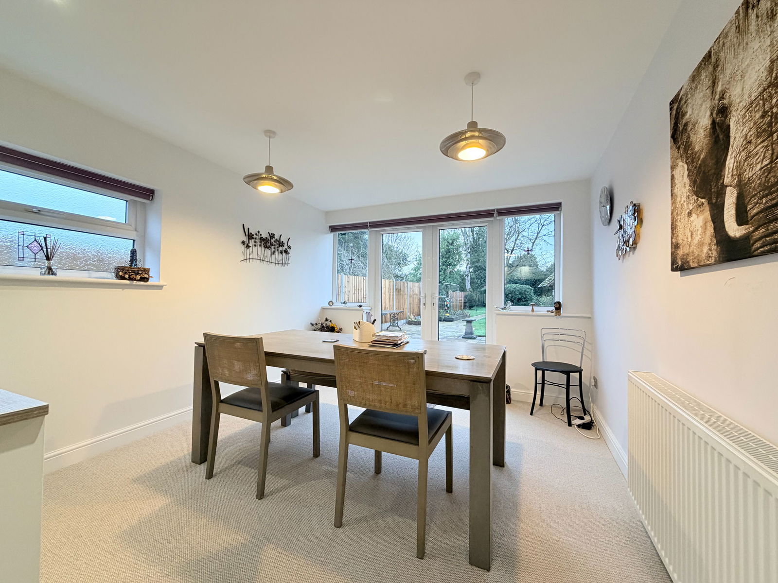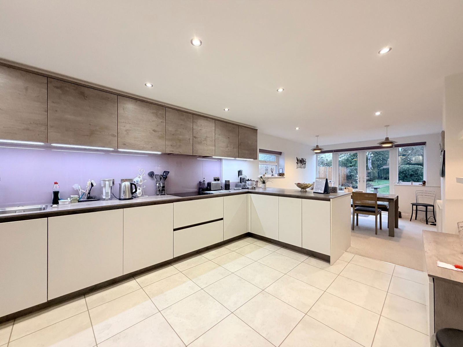 The dining kitchen has been fitted with a contemporary range of handle-less units, complemented by wood-effect slimline work surfaces and feature recessed lighting. Appliances include an integrated dishwasher, inset eye-level double oven and microwave and an American-style fridge freezer. The open-plan dining area enjoys windows and French doors leading out to the rear garden. From the kitchen, a lobby provides side access to the garden and leads to a good-sized utility room with washer dryer, sink, cupboard storage, ample drying space and a door into the garage.