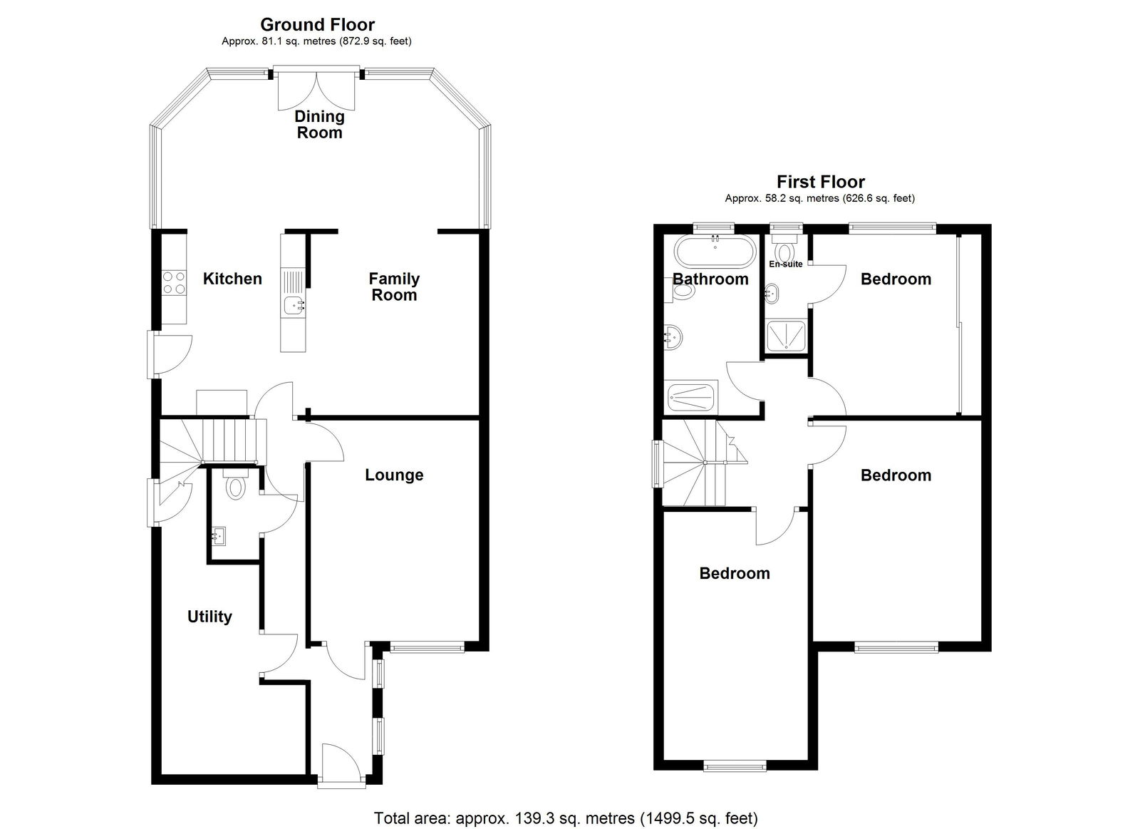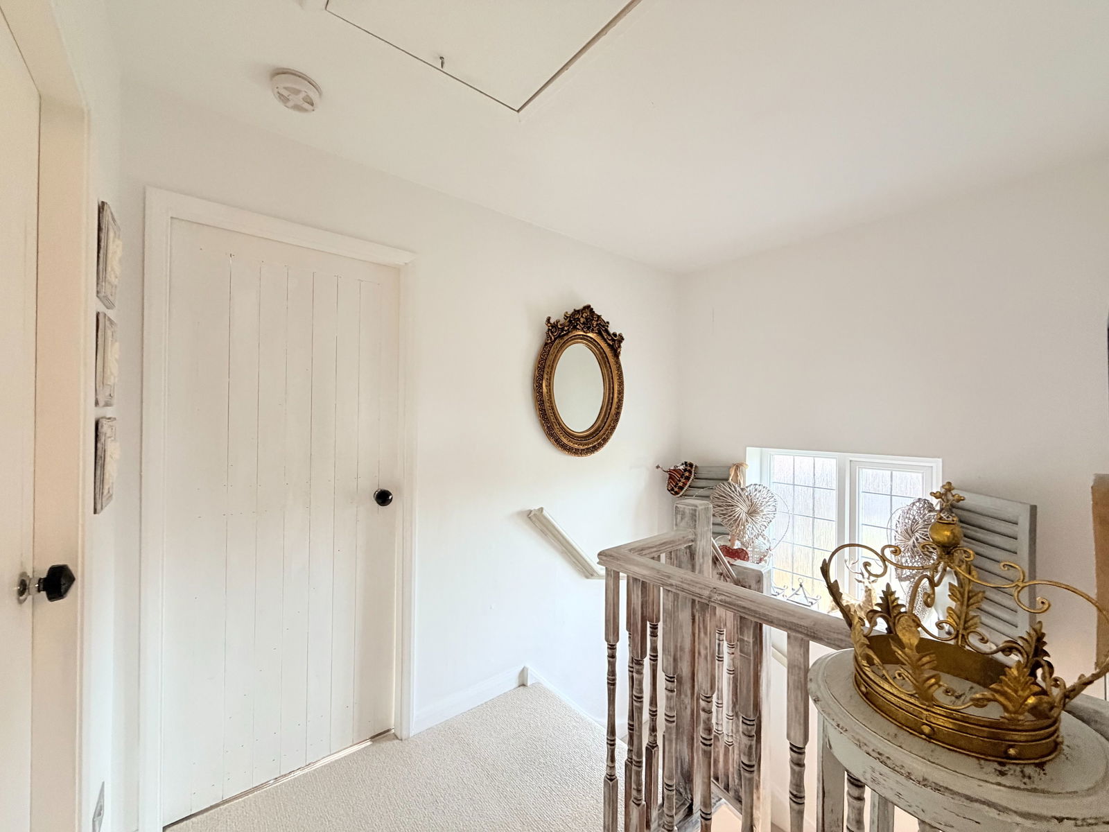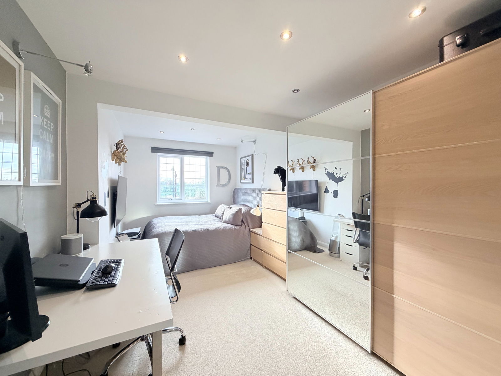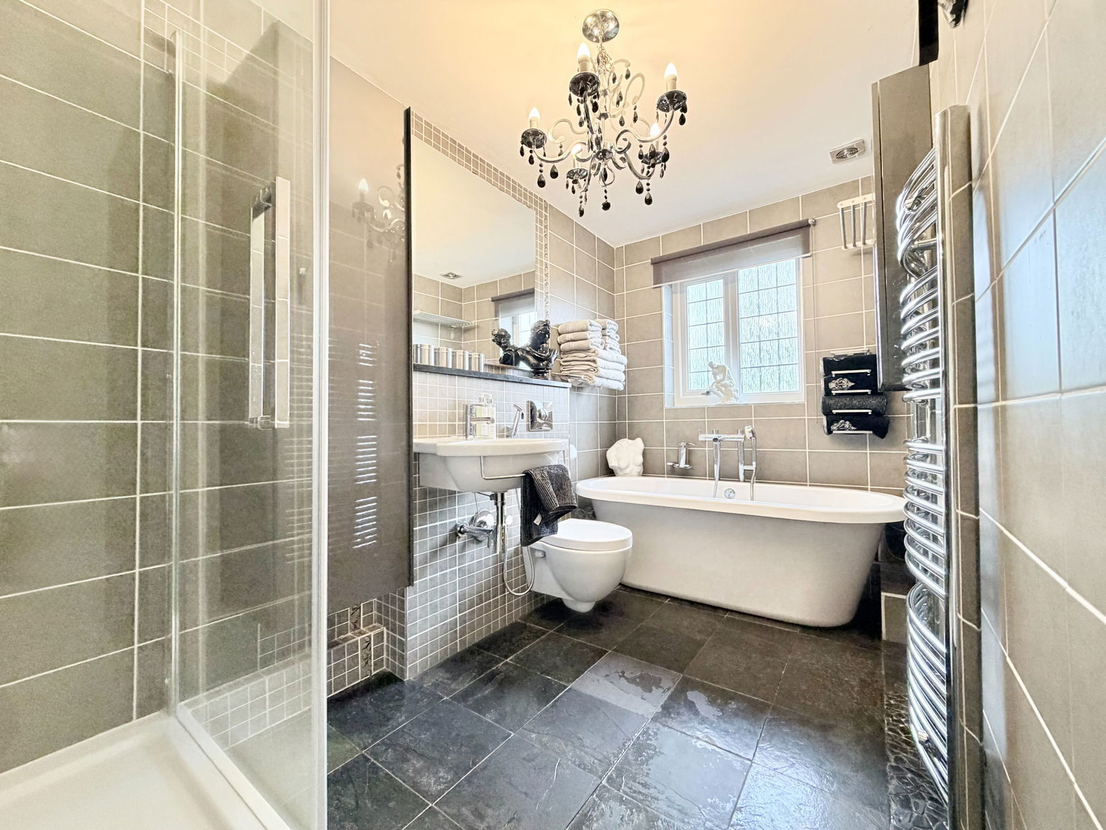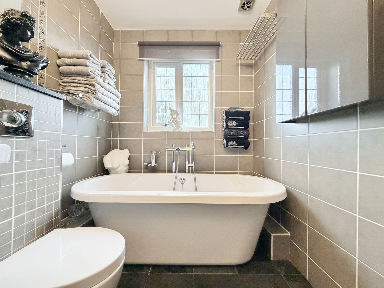 To the first floor, the principal bedroom is positioned to the rear and is fitted with full-length mirrored wardrobes, complemented by a modern en-suite shower room. Two further double bedrooms are located to the front of the property, both enjoying open views and fitted with schoolhouse-style radiators. The stylish four-piece family bathroom is to the rear and boasts a freestanding bath with floor-mounted mixer tap and shower attachment, a separate shower cubicle and complimentary tiling.