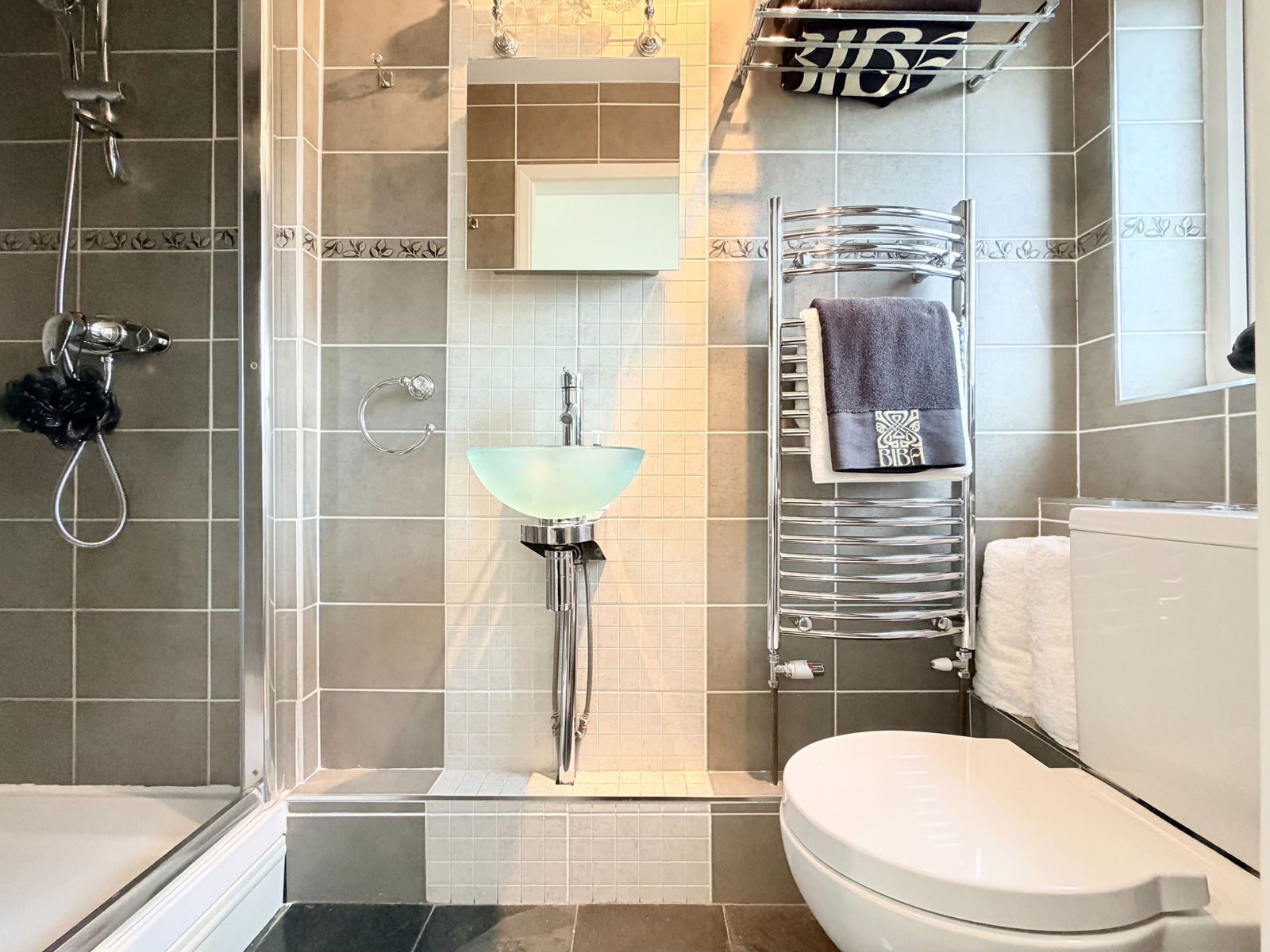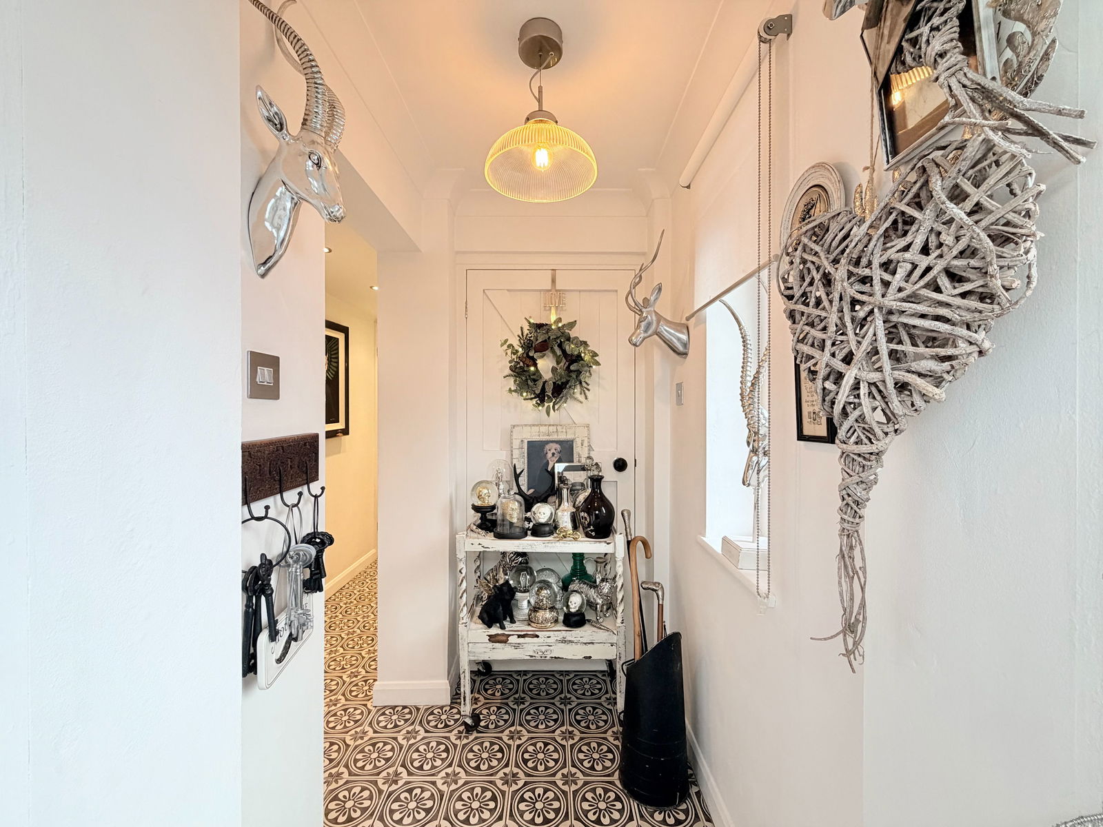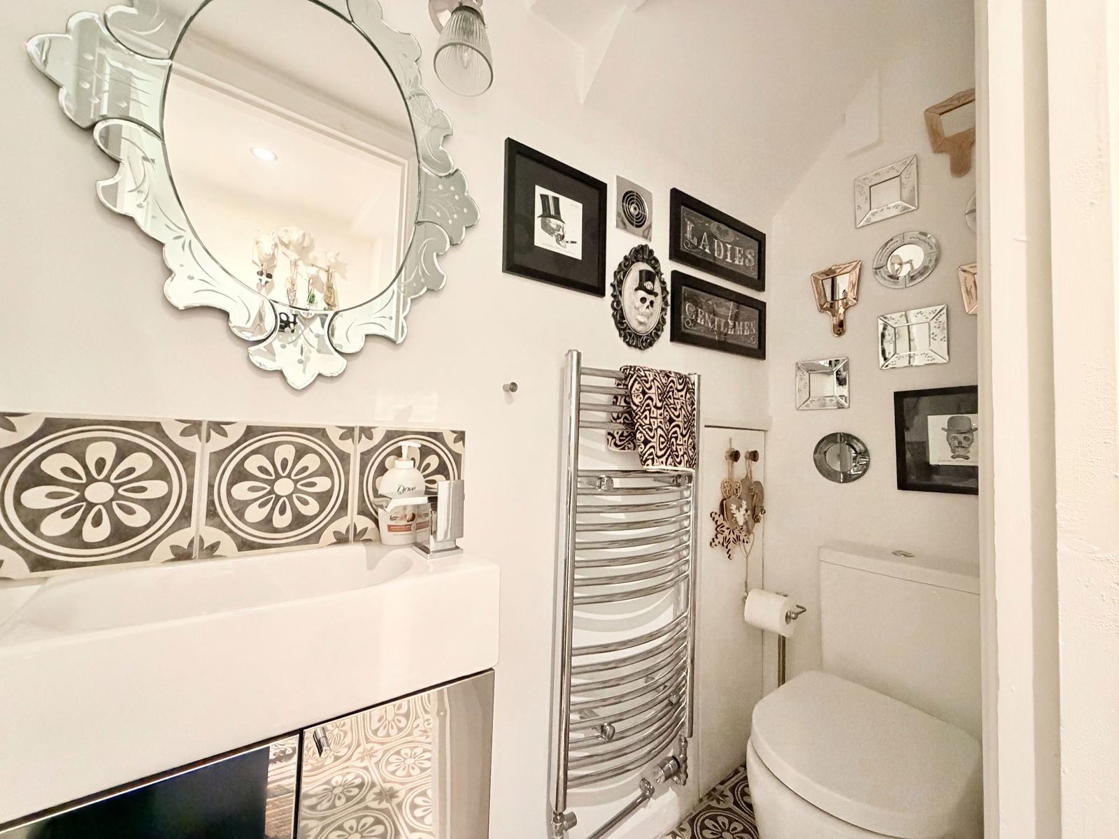 The lounge is a well-proportioned and inviting space, enjoying open views to the front, a feature schoolhouse-style radiator and a secondary door returning to the hallway. The guest WC is finished with decorative tiling and a contemporary suite.