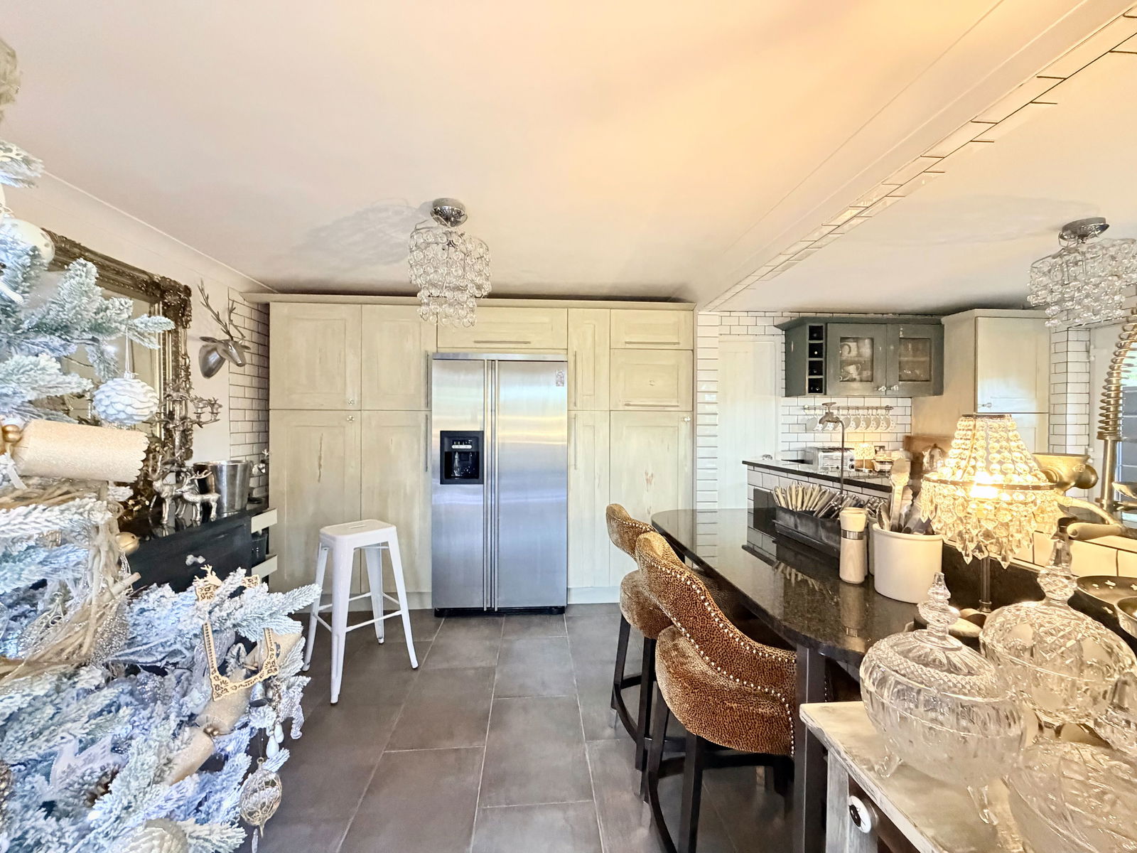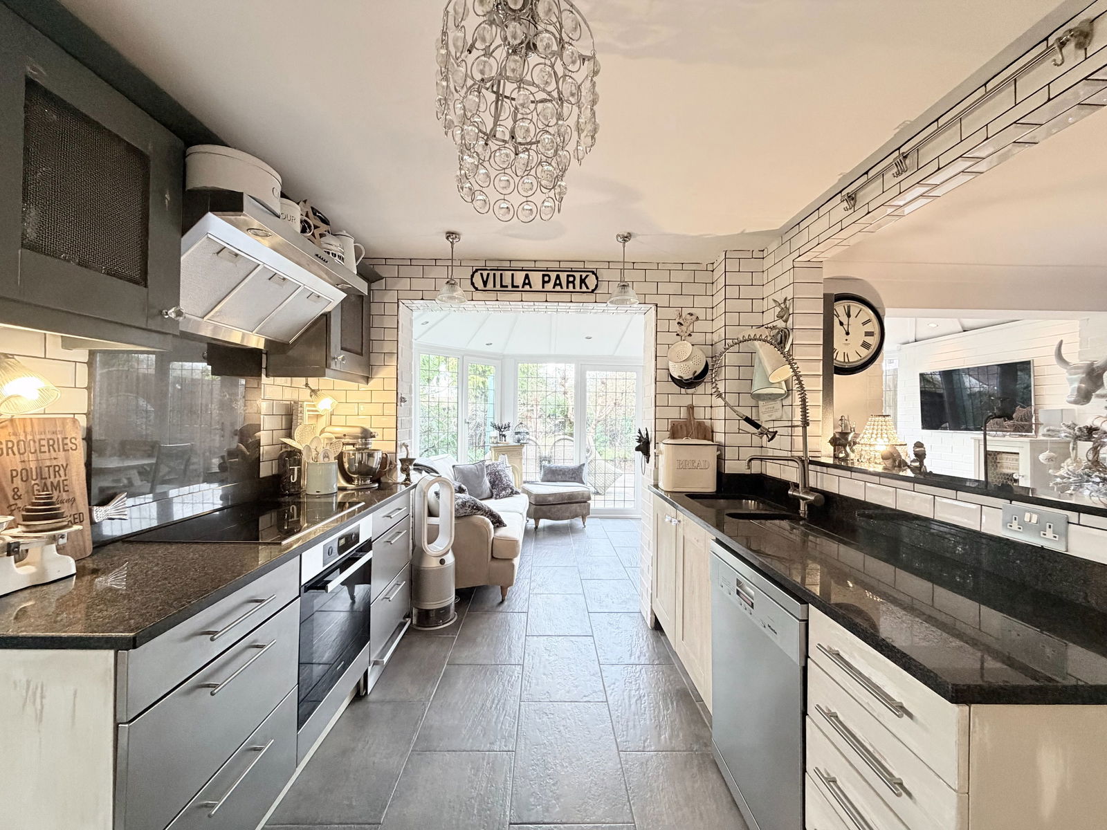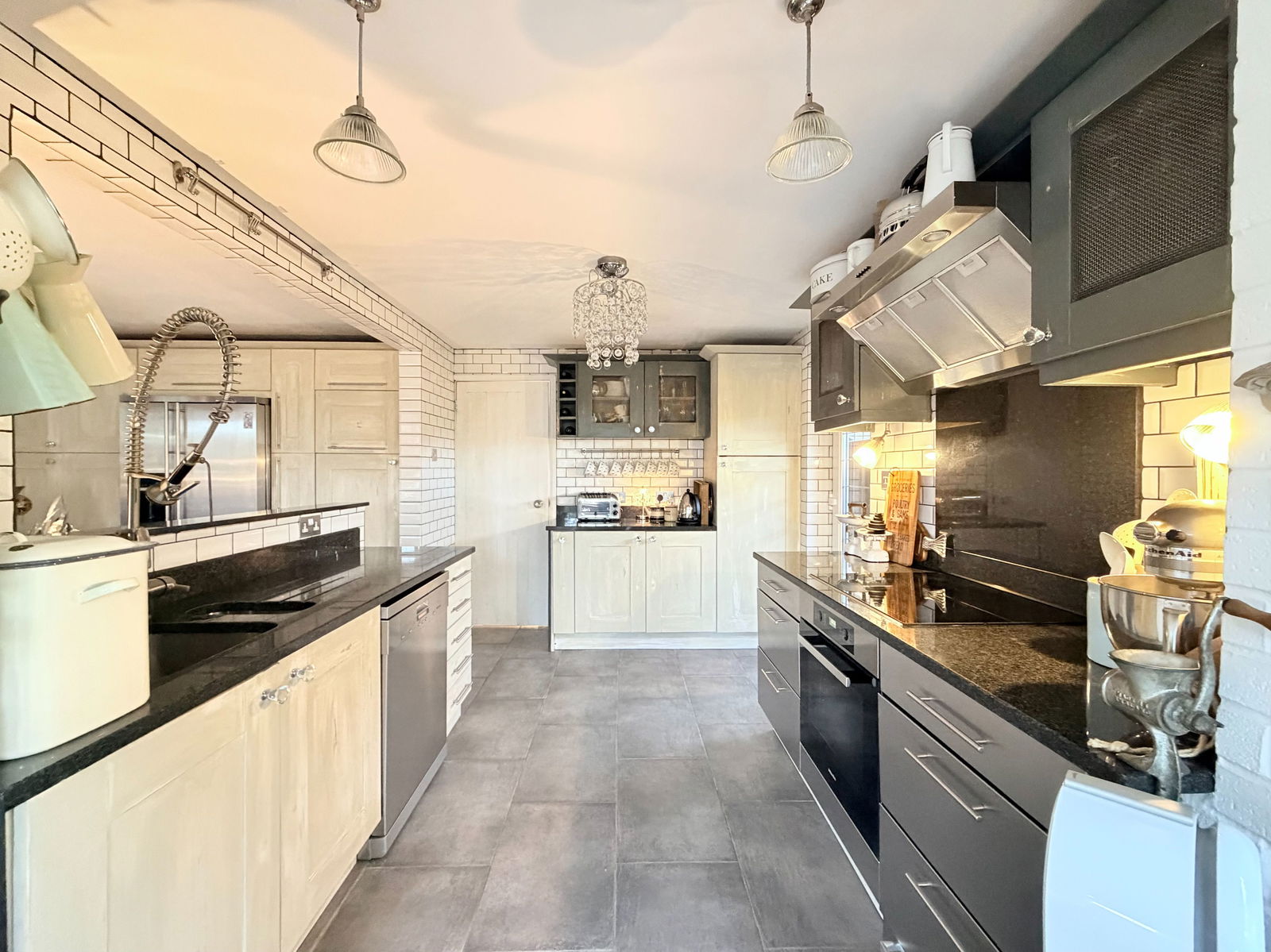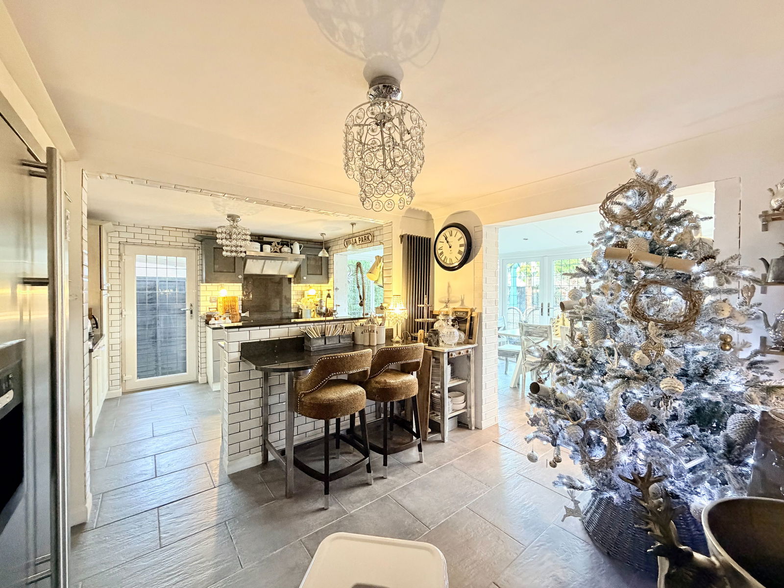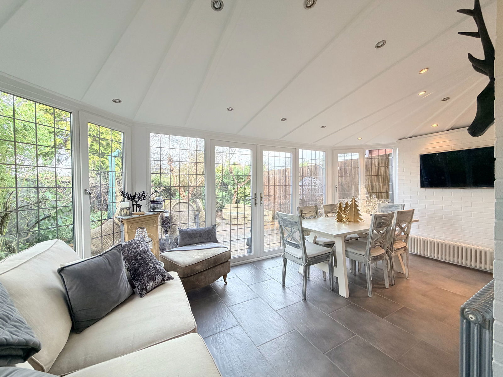 The impressive breakfast kitchen forms the heart of the home, offering an excellent family and entertaining space. It features granite work surfaces, a breakfast bar seating area, space for a dishwasher and an American-style fridge freezer, along with a large electric hob, granite splashback and a statement extractor canopy. The kitchen flows seamlessly into a warm-roof conservatory, currently used as an additional living and dining area, complete with a schoolhouse-style radiator and French doors opening onto the decked patio.