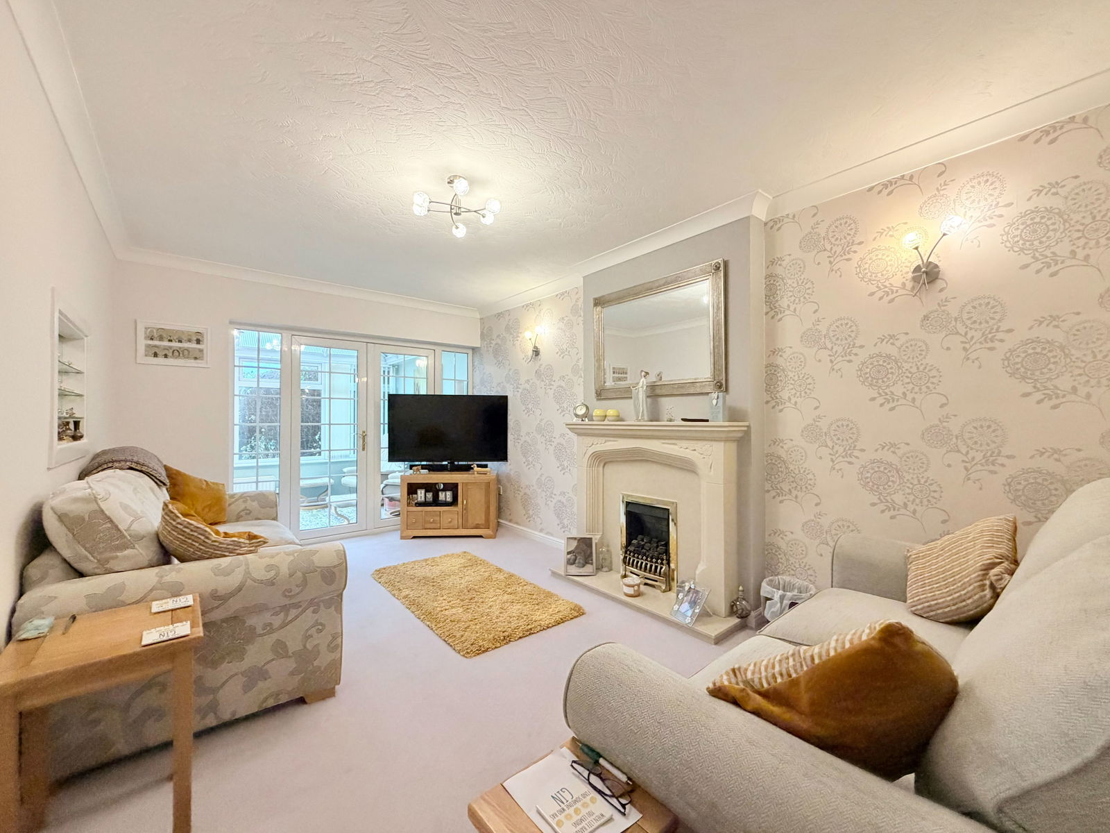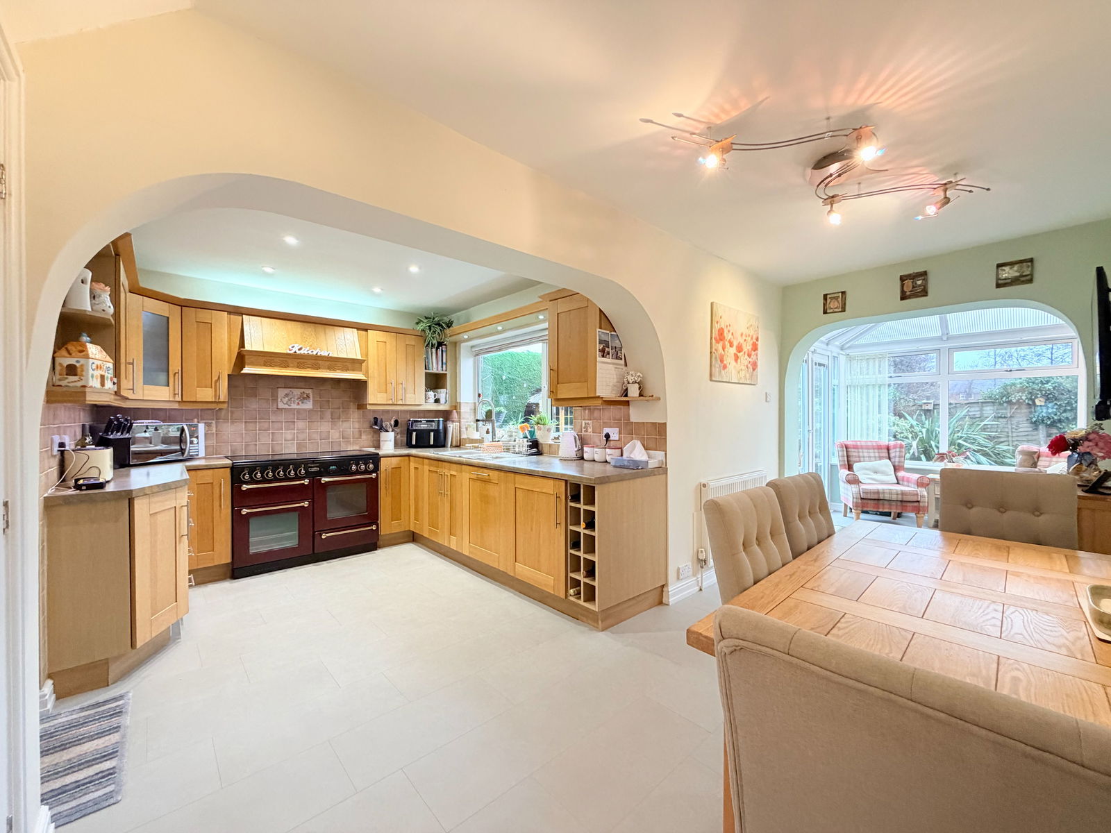 The ground floor accommodation includes a well-proportioned lounge featuring a gas fireplace and windows with French doors opening into the conservatory. To the side, an extended dining kitchen is open plan to the conservatory, creating an excellent space for modern family living and entertaining. The kitchen is fitted with integrated appliances including a dishwasher and fridge, a large Rangemaster oven, useful under-stairs storage, a door to the garden, and ample space for a dining table. The conservatory benefits from a vaulted ceiling, a wall-mounted ethanol fireplace, and French doors opening out to the garden.