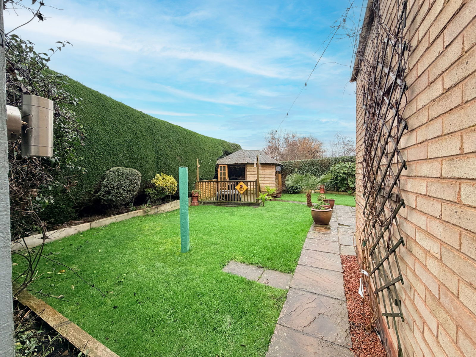 Externally, the property enjoys an attractive southerly-facing garden that wraps around to the side. The garden features a timber tiki-style bar with electricity, a greenhouse, and gated access back to the driveway, making it a fantastic space for both relaxation and entertaining.