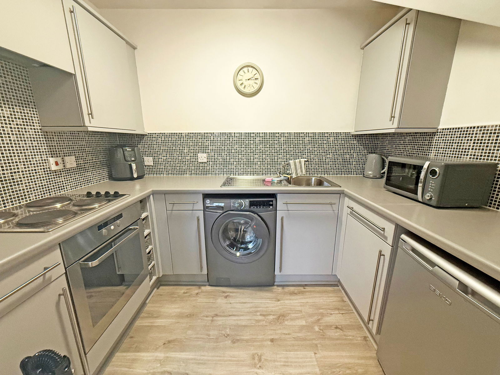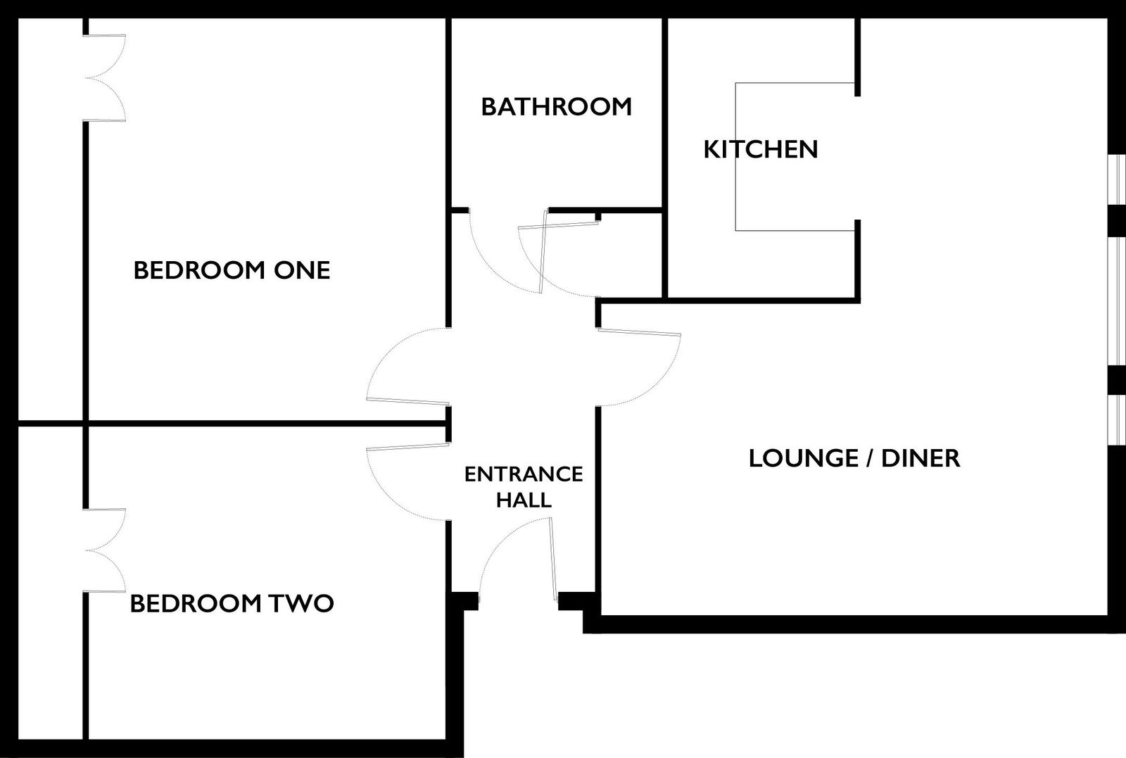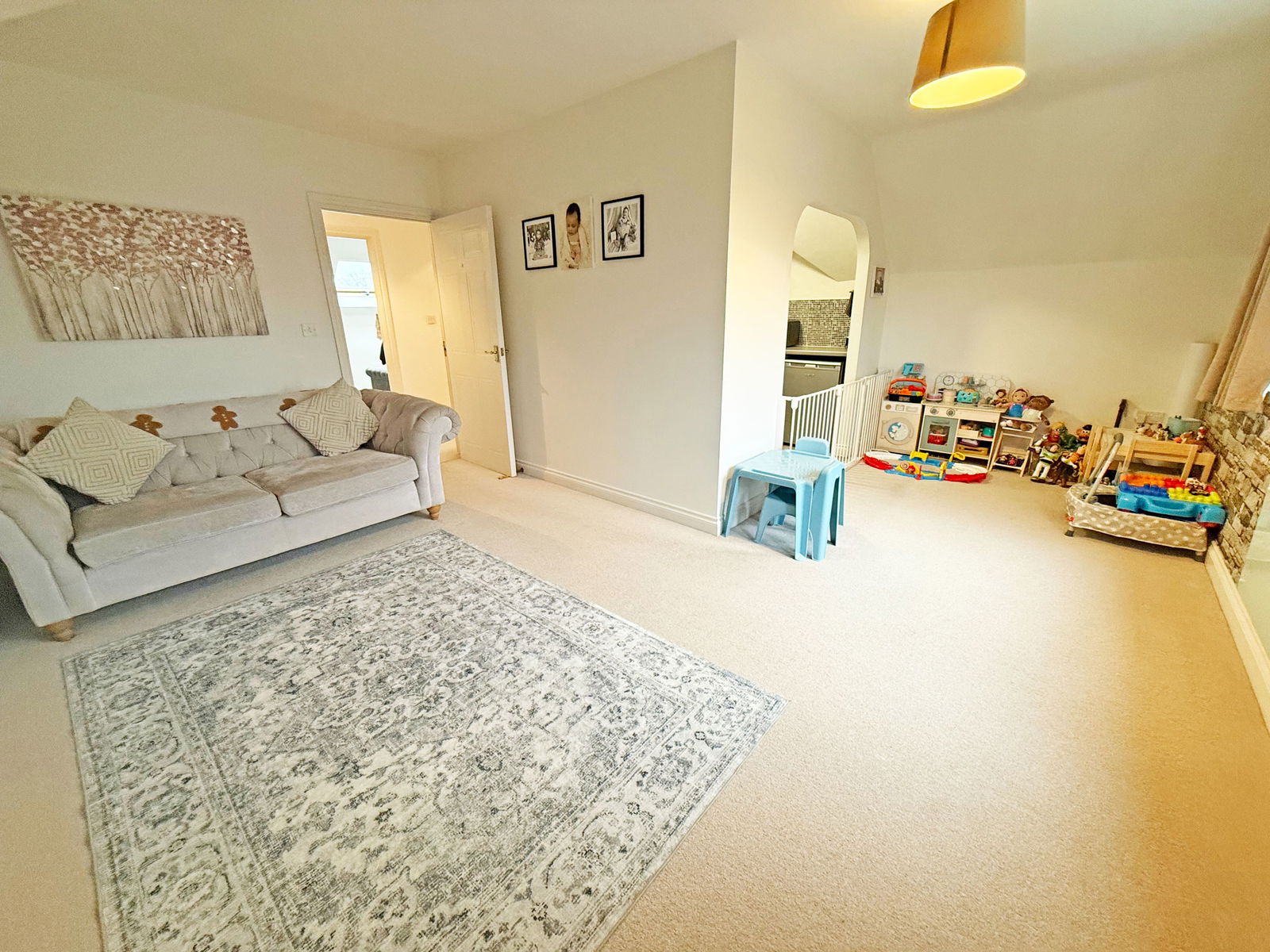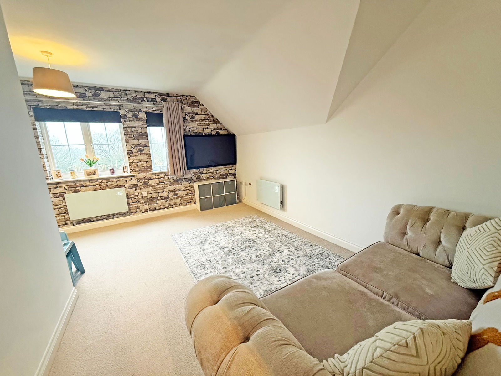 The private entrance hall features doors to all principal rooms and includes a storage cupboard. It gives access to a spacious L-shaped lounge/dining room, which opens into a modern kitchen. The accommodation further comprises two double bedrooms and a bathroom.