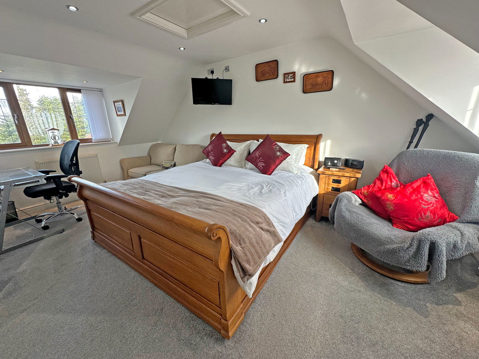 This bespoke detached dormer bungalow, built in 2006, is situated within walking distance of Earlswood Lakes, providing the opportunity of long walks within a rural setting with beautiful wildlife. The property sits back from the road behind a generous driveway providing off-road parking. The welcoming reception hall has a sweeping Solid Oak staircase rising to the first floor and doors radiating off to all of the ground floor accommodation. The heart of this beautiful home is a large farmhouse-style dining kitchen, complete with integrated appliances and an Esse ‘Aga style’ wood burner and cooker, with additional oven and hotplates, set within a beautiful inglenook fireplace. The rest of the ground floor accommodation radiates off the kitchen, including the utility room, which in turn leads to the guest WC. There is a comfortable lounge to the rear with French windows and oak flooring. The ground floor space boasts underfloor heating. There is a good-sized double bedroom to the front, complete with fitted wardrobes and an en-suite wet room. On the first floor, you will find a large linen cupboard and study, plus two exceptional double bedrooms, both have ensuites, the largest of which boasts a walk-in wardrobe. The rear garden has a large paved patio and a hard-standing area, plus a well-maintained lawn and border. There is a detached garage which has power, light, a water supply, and a loft ladder leading to a boarded loft, also with lighting. The garage is large enough to house a vehicle and storage cupboards, ideal for a skilled tradesperson. This splendid property needs to be viewed in order to be fully appreciated.