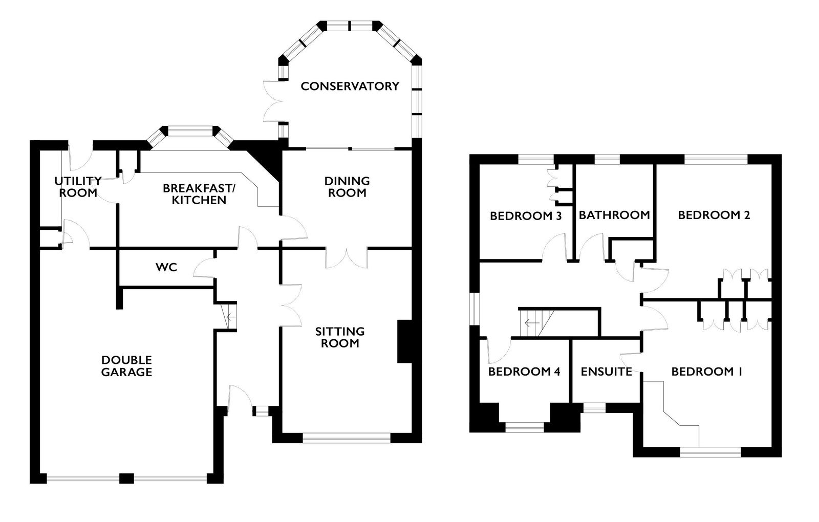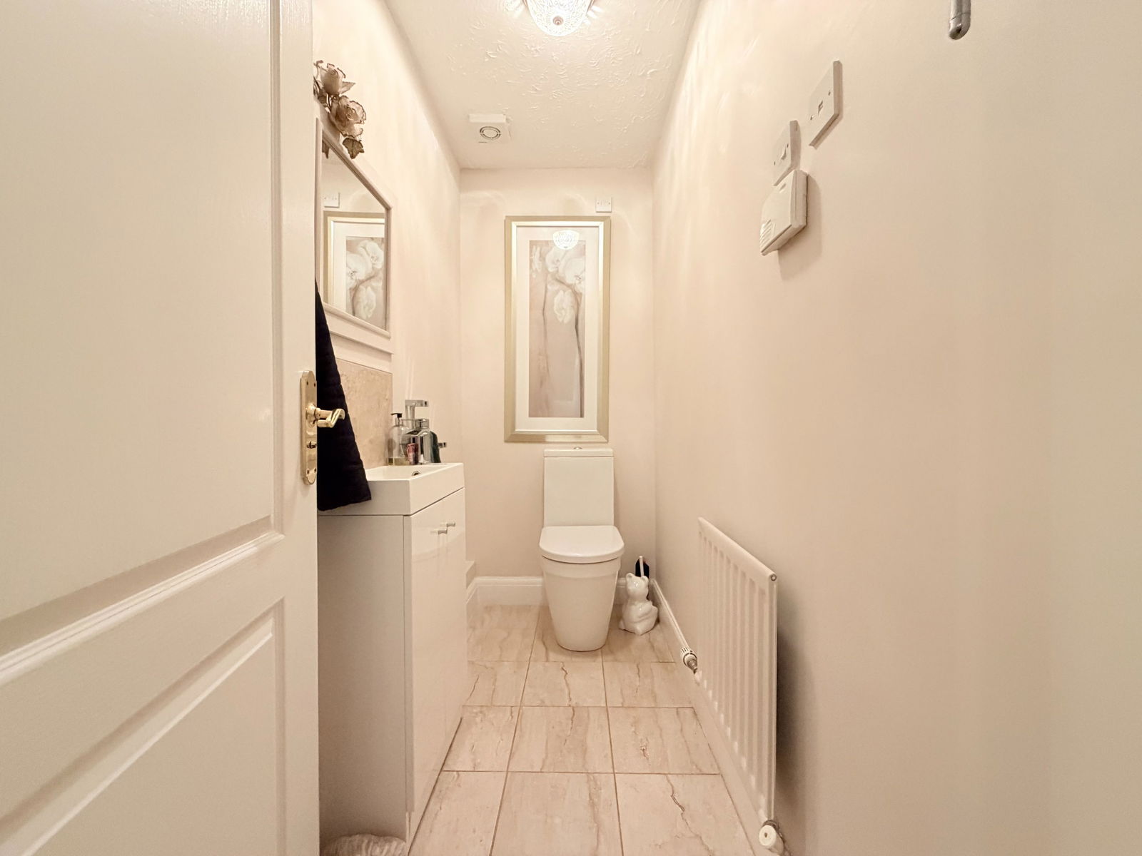 The breakfast kitchen has been finished to a high standard with an attractive range of units, Quartz work surfaces and a comprehensive selection of integrated appliances, including fridge, freezer, dishwasher, eye-level oven and grill, and a gas hob with a feature tiled extractor canopy. The kitchen opens into a spacious utility room with matching cabinetry and work surfaces, additional sink unit, contemporary tiling and a washer dryer, along with access to the rear garden and an internal door into the double garage. Also off the reception hall are a guest WC and stairs rising to the first floor.