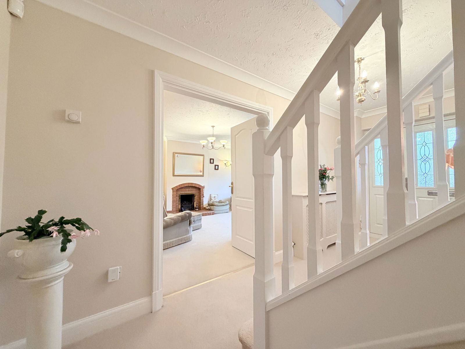 The home enjoys attractive kerb appeal, set behind well-manicured front lawns and a block paved driveway providing off-road parking for up to three vehicles, leading to double garage doors. Gated side access opens to the delightful south-west facing rear garden, while a storm porch with an attractive front door welcomes you into a spacious and inviting reception hall.