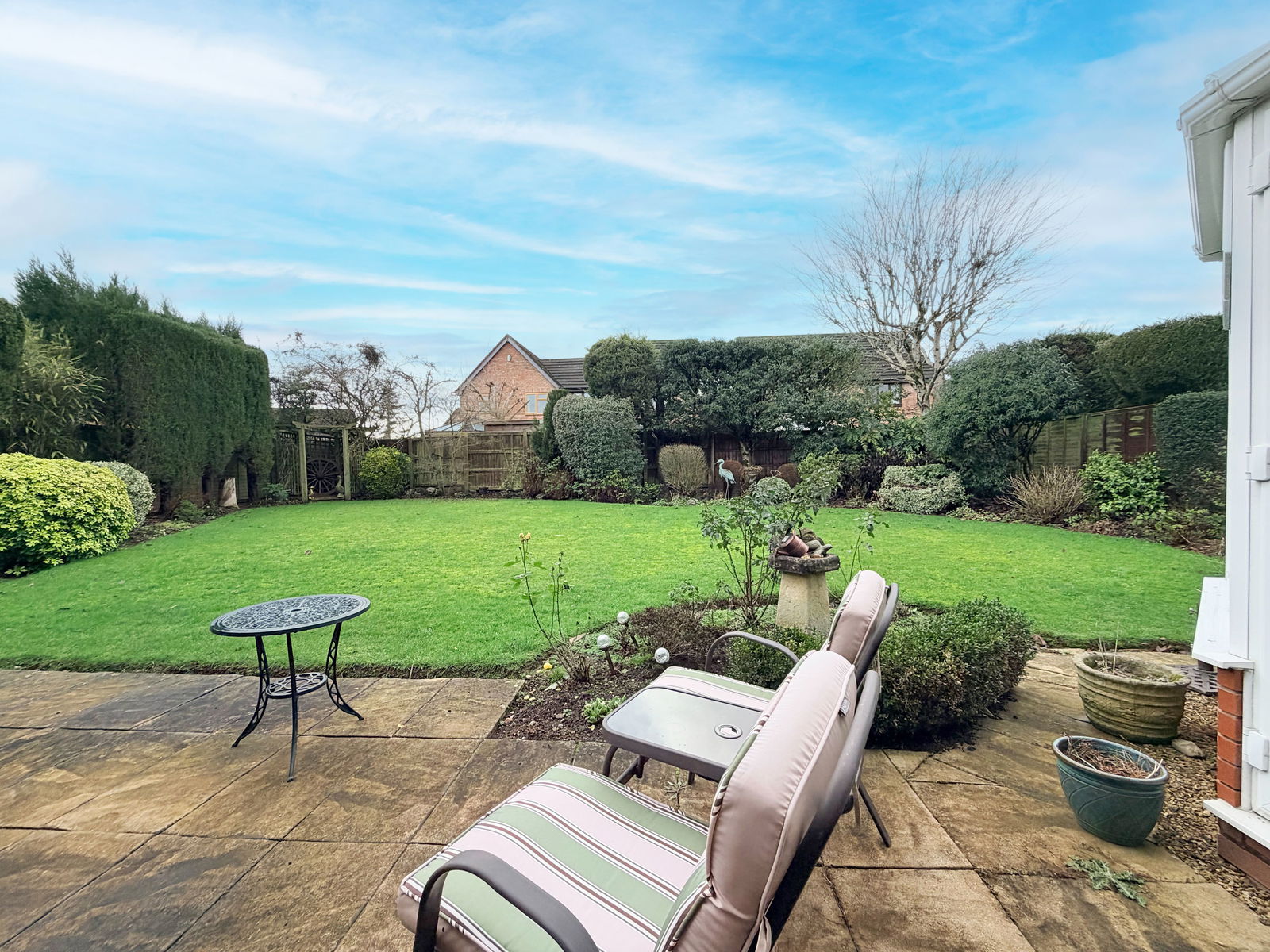 Externally, the south-facing rear garden is a particular highlight, offering a well-maintained lawn, mature shrubbed borders and a paved patio area sweeping to the side, where there is a good-sized timber shed and gated access back to the front driveway.