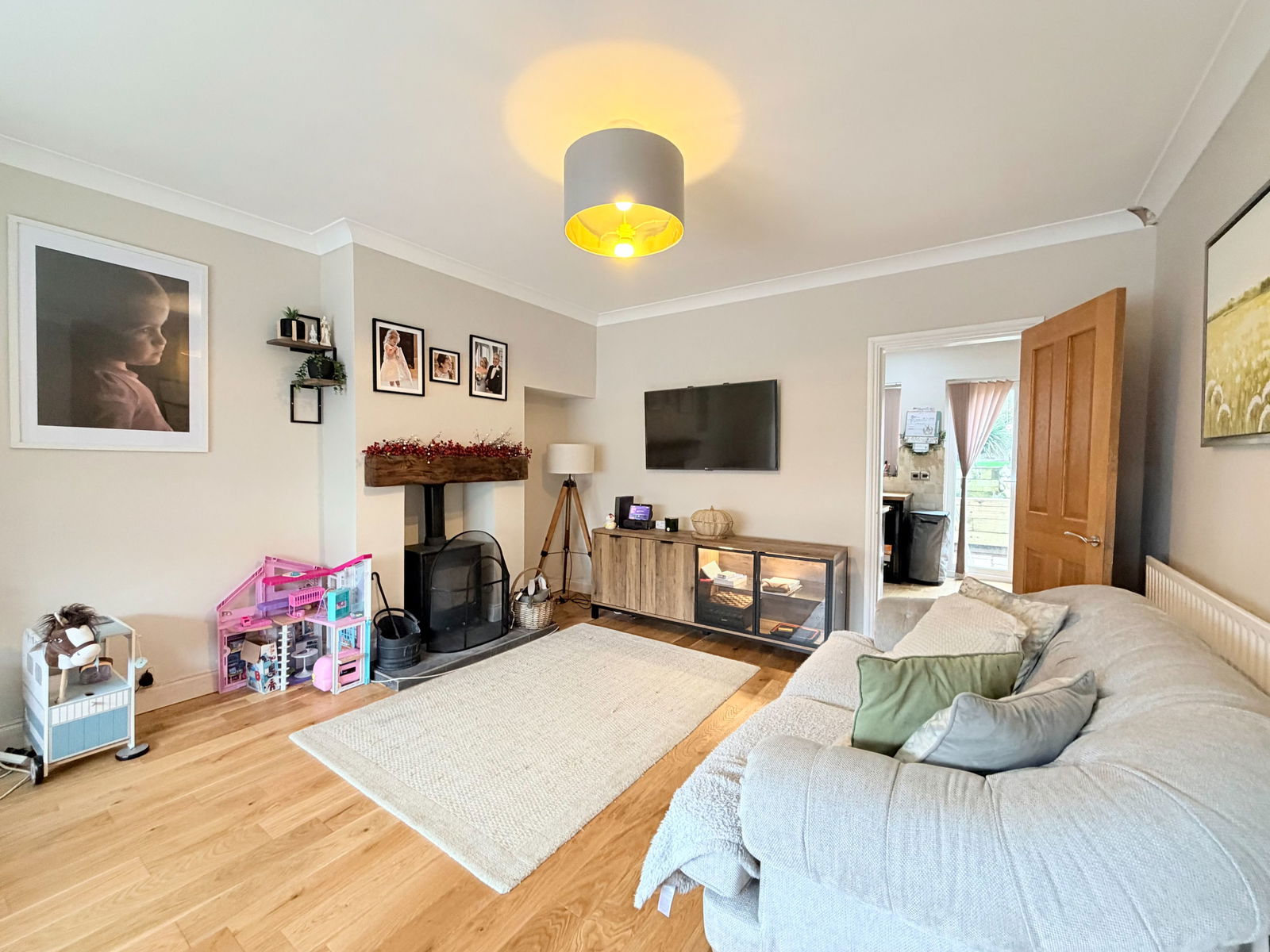 The lounge provides an attractive and cosy family space, featuring a multi-fuel log burner with wooden mantle over and engineered oak flooring, creating a warm and inviting focal point. To the rear, the contemporary kitchen is fitted with high-gloss units and benefits from an integrated smart oven with built-in air fryer option, alongside space for further appliances and a breakfast table. French doors open directly onto the rear garden, enhancing the indoor-outdoor flow.