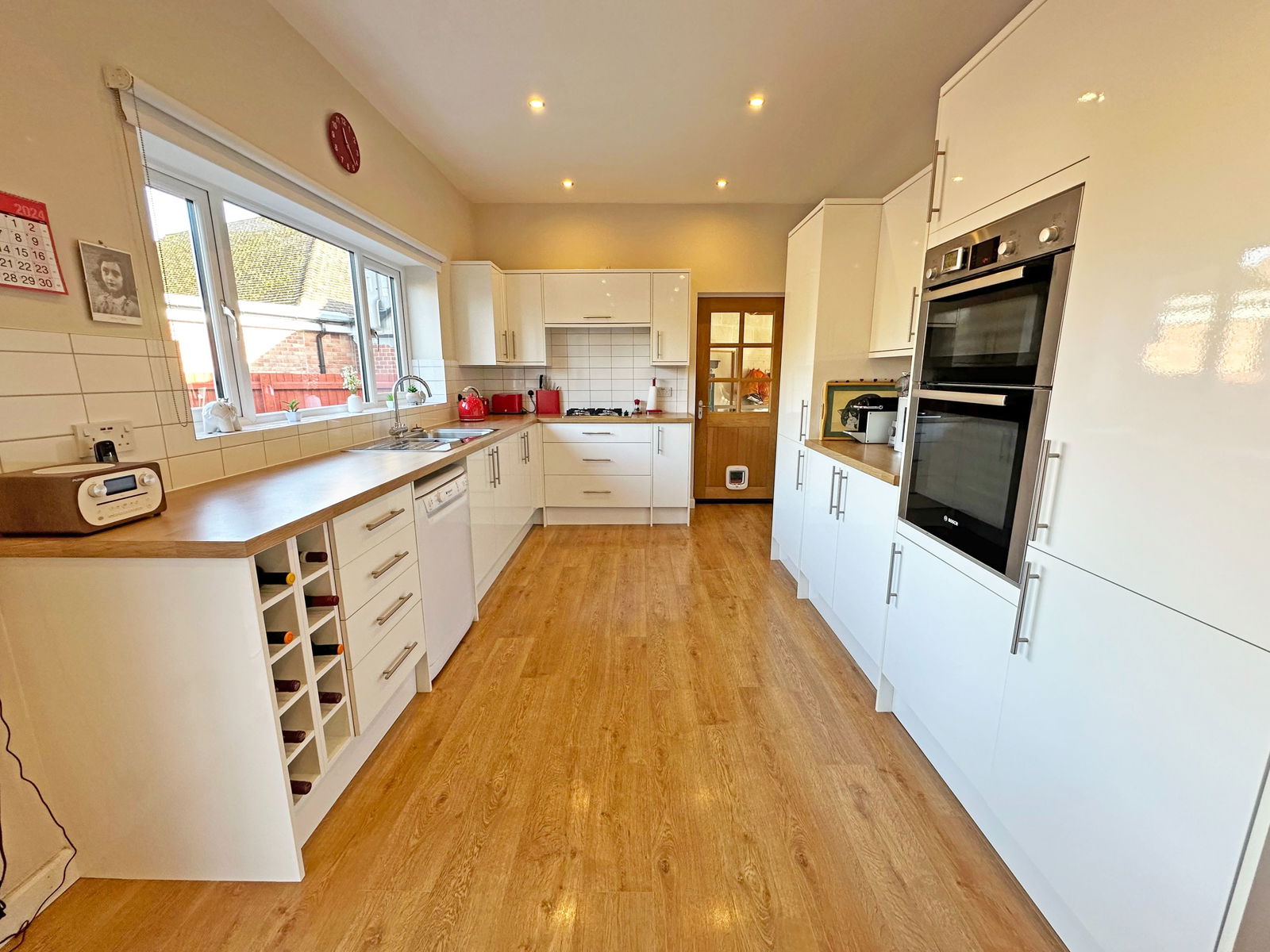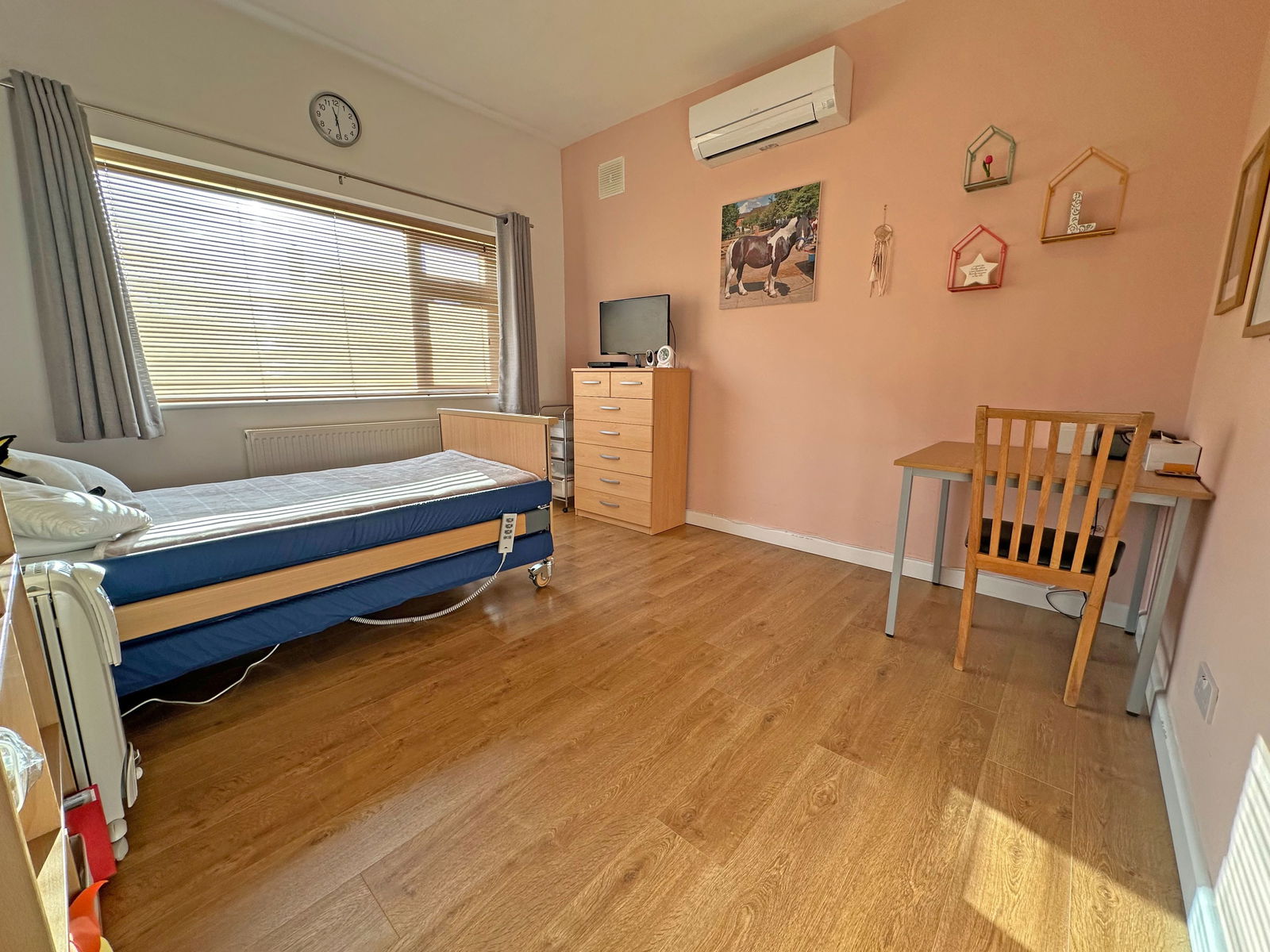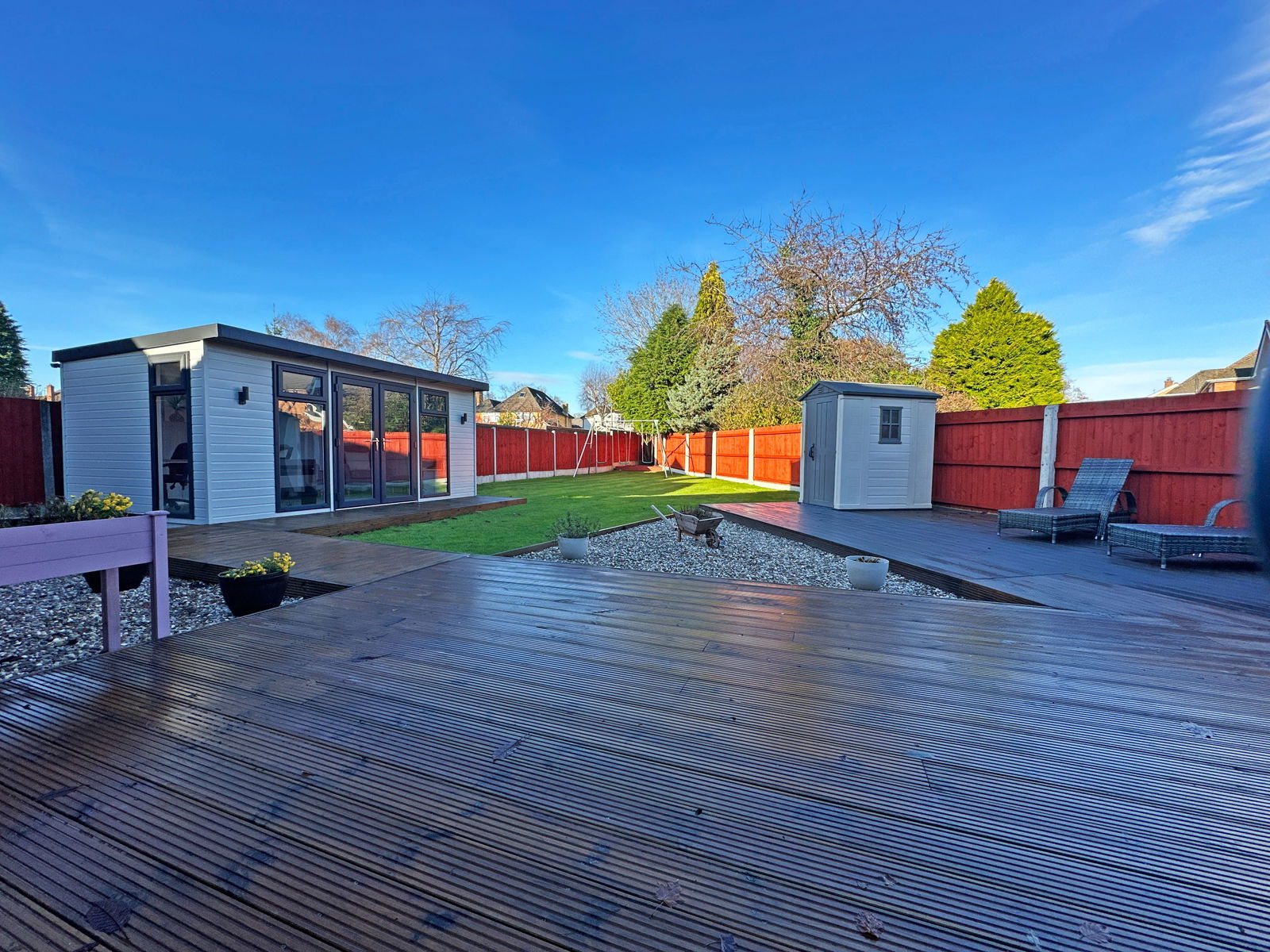 This spacious five bedroom link-detached dormer bungalow is set on a corner plot behind a brick built retaining wall and wrought iron gate with a pathway surrounded by lawned fore gardens leading to the entrance porch. To the side of the gardens is tarmacadam driveway providing ample off road parking which extends to the garage and lean-too which has wheelchair friendly access into the kitchen. Returning back the entrance porch which is entered via a UPVC double glazed front door there is a feature wooden door leading into the reception hall, which has staircase rising to the first floor and doors radiating off the to ground floor accommodation. To the front of the property you will find the light and airy lounge with a feature fireplace and two bedrooms, one of which has air-conditioning, to the rear of the property you will find a further bedroom, refitted bath/wet-room and the dining kitchen. The dining kitchen is fitted with ample wall and base units with built in oven and hob and an integrated fridge freezer, there are French doors which lead out to the decked patio terrace and there is a door leading into the lean-too/utility which also gives access to the garage. On the first floor there are a further two bedrooms both fitted with air-conditioning and a refitted shower room. The rear garden is a good size and has recently been landscaped with a large decked patio and lawned garden and recently constructed in Summer 2024 there is a summer house/home office which has power and lighting and is a great addition to this lovely garden.